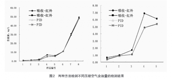采用PID檢測法檢測過程中發現,PID檢測法是一種非破壞性檢測法,不會改變待測氣體分子,經過PID檢測的氣體仍可被收集繼續使用,因此,PID檢測法可考慮用于壓縮空氣含油量的在線監測。