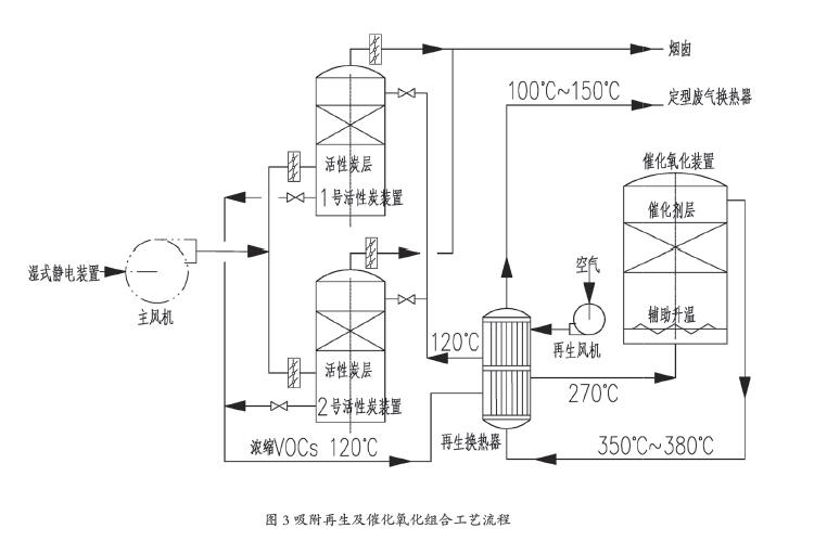在主風機出口引入活性炭裝置和催化氧化裝置(圖3)?;钚蕴垦b置設置2套,互為備用,當一套活性炭裝置吸附飽和后,將廢氣切換到另一套活性炭裝置。飽和的活性炭裝置進入活性炭再生,脫附的有機物引入催化氧化裝置分解成水和二氧化碳。經催化氧化裝置處理后的廢氣再回至定型廢氣換熱器回收余熱。