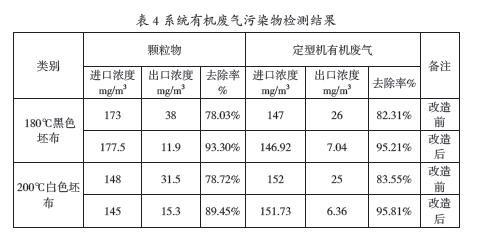 該文所提出的紡織印染定型機有機廢氣凈化處理技術工藝,即在原定型有機廢氣濕式靜電處理系統的基礎上進行技術改造,新增加了活性炭吸附、再生處理和催化氧化裝置系統,VOCs總的脫除效率達到95%以上。通過現場實際檢測顆粒物除效率為93.3%和89.45%,VOCs總的脫除效率為95.21%和95.81%。