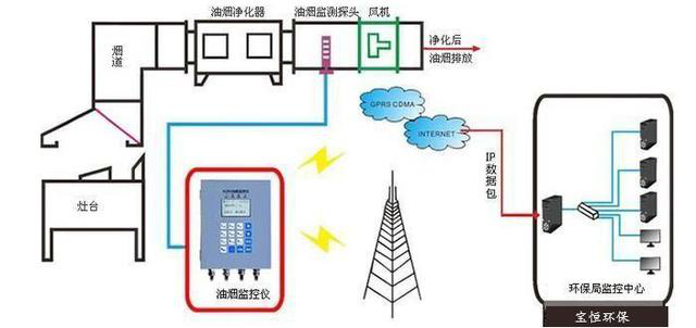 餐飲油煙在線監控設備脫胎于大氣質量監測設備,油煙在線監控設備一般安裝在餐飲企業的油煙排放管附近,集成GPRS 無線通信模塊,采用實時在線、自動上報的方式運行。監控獲取的各類環保數據通過系統大數據算法分析,結合各類監測指標,評估區域內的餐飲企業排污情況;協助環保部門進行大數據分析、在線監控、輔助決策、協助執法。