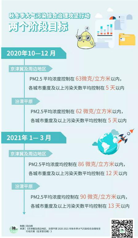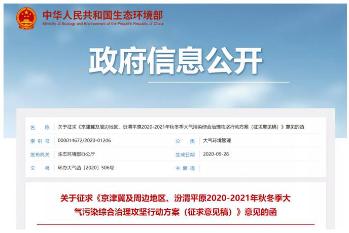 2020-2021 年秋冬季是第 4 個攻堅季,事關全面建成小康社會,事關“十三五”規劃和打贏藍天保衛戰圓滿收官。9月28日,生態環境部發布《京津冀及周邊地區、汾渭平原2020-2021年秋冬季大氣污染綜合治理攻堅行動方案(征求意見稿)》,持續開展秋冬季大氣污染綜合治理攻堅行動,確保如期完成打贏藍天保衛戰既定目標任務。
