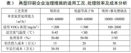 印刷企業典型治理措施的適用工況、處理效率及成本分析見表3。