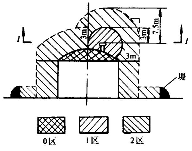 圖中所示,對于露天油罐而言,0區一般存在于油罐的上方,1區一般存在于油罐呼吸閥的周邊,而其他周邊位置一般為2區。