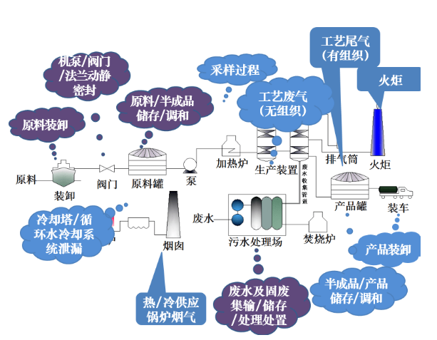 石油煉制工業大氣污染物排放解決方案 排放特征 煉油與石油化工行業VOCs主要來自工藝有組織排放、火炬氣、工藝無組織排放、有機液體存儲與調和揮發、廢水收集及處理過程、設備動靜密封點泄漏、有機液體裝卸揮發、冷卻塔和循環冷卻水系統等十二個有組織和無組織排放源項。其中,VOCs工藝有組織排放占比相對較小。 ..2021-08-23